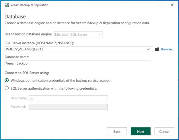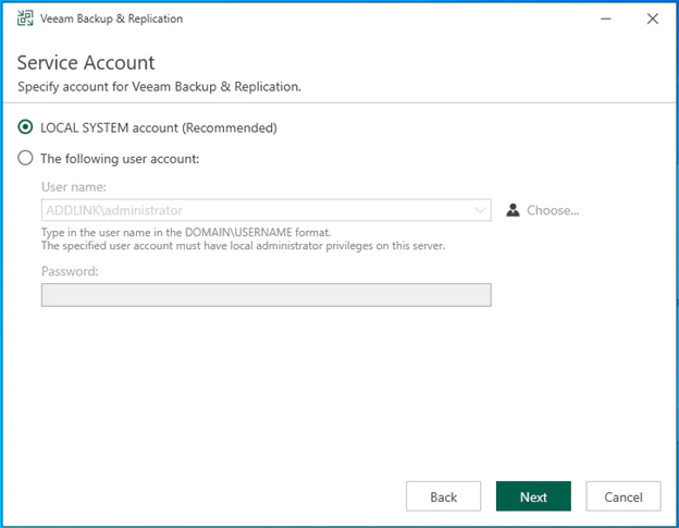 รูปที่ 10 ระบบแสดง service account สำหรับการ start veeam ซึ่งโดยปกติก็ไม่จำเป็นต้องเปลี่ยน เว้นเสียแต่ว่า ท่านตค้องการใช้ Account ตัวอื่นในระบบโดเมนของท่านในการ start service veeam และกด Next